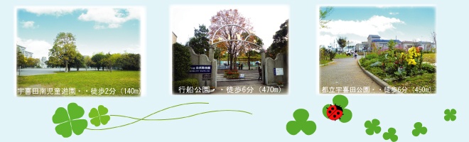 「宇喜田南児童遊園」まで徒歩2分、「行船公園」・「都立宇喜田公園」まで徒歩6分
