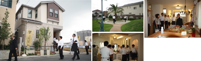 ヤシの木をシンボルツリーに据えたタウン内公園見学の後、2棟のモデルハウス内では、各社実際に設置・施工された設備や部材をご覧頂き、こだわりの間取りとインテリアコーディネート含めた完成度に、多くの賛辞の言葉を頂戴でき、また各社相互の活発な意見交換がなされました。