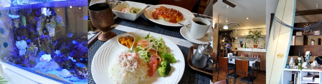 店内入るとまず大きな水槽と魚が目に入り、貝のインテリアにサーフボード、くるくる回るシーリングファンと、海のない越谷にナゼ?という