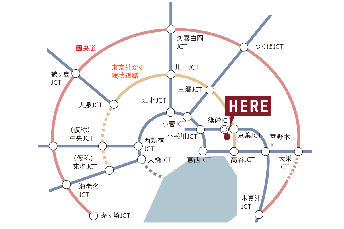 我が家から「篠崎IC」まで車でスムーズにアクセス可能。都心方面も遠方への移動も軽快で、快適なカーライフを実現します。家族の休日の遠出も多彩に広がります。(篠崎IC 京葉道路/1,030m)