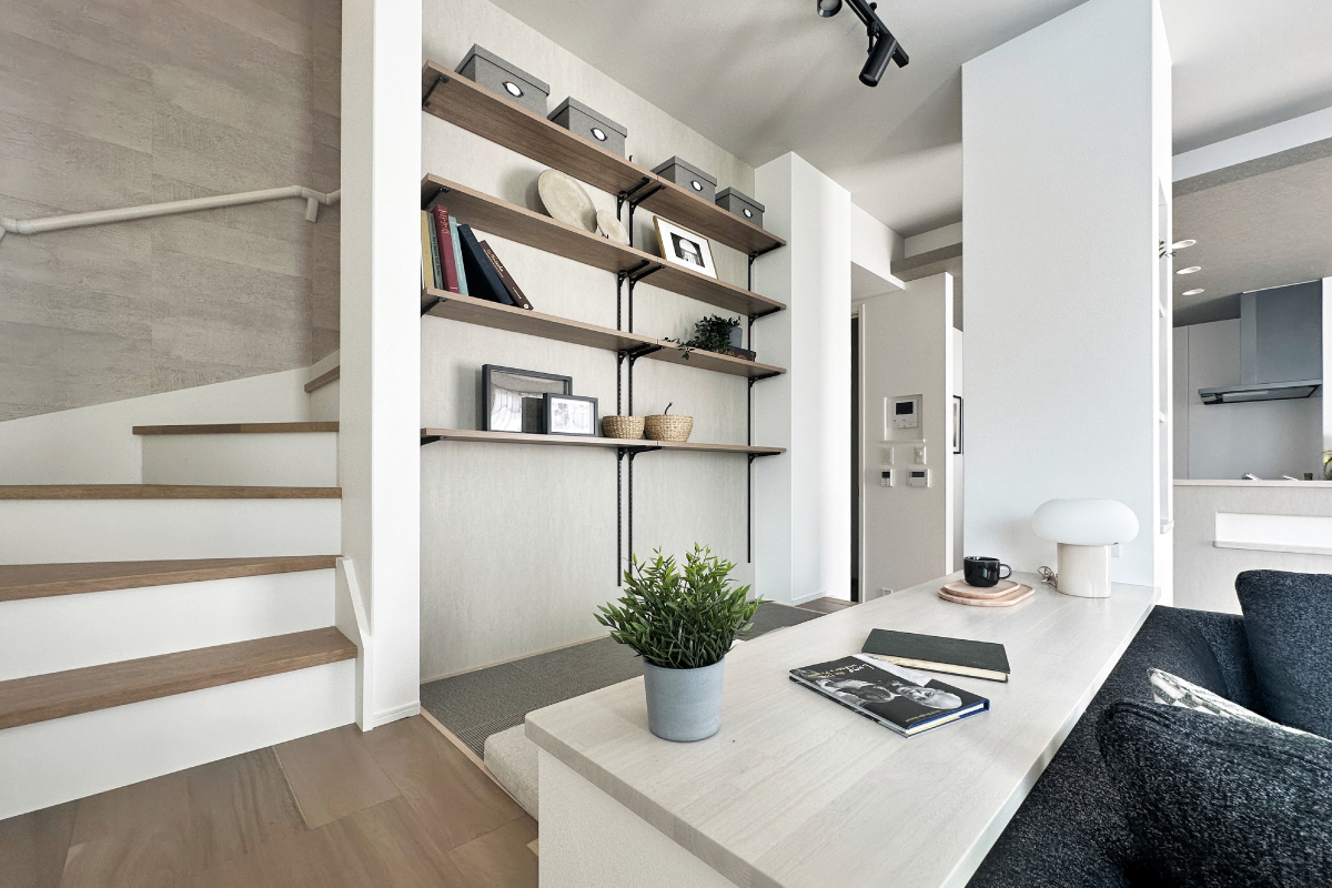 • リビングの一角に設けたスキップDENは、段差によって半個室感覚を持たせました。フロアには心地よい肌触りのテキスタイルフロアを使用しています。