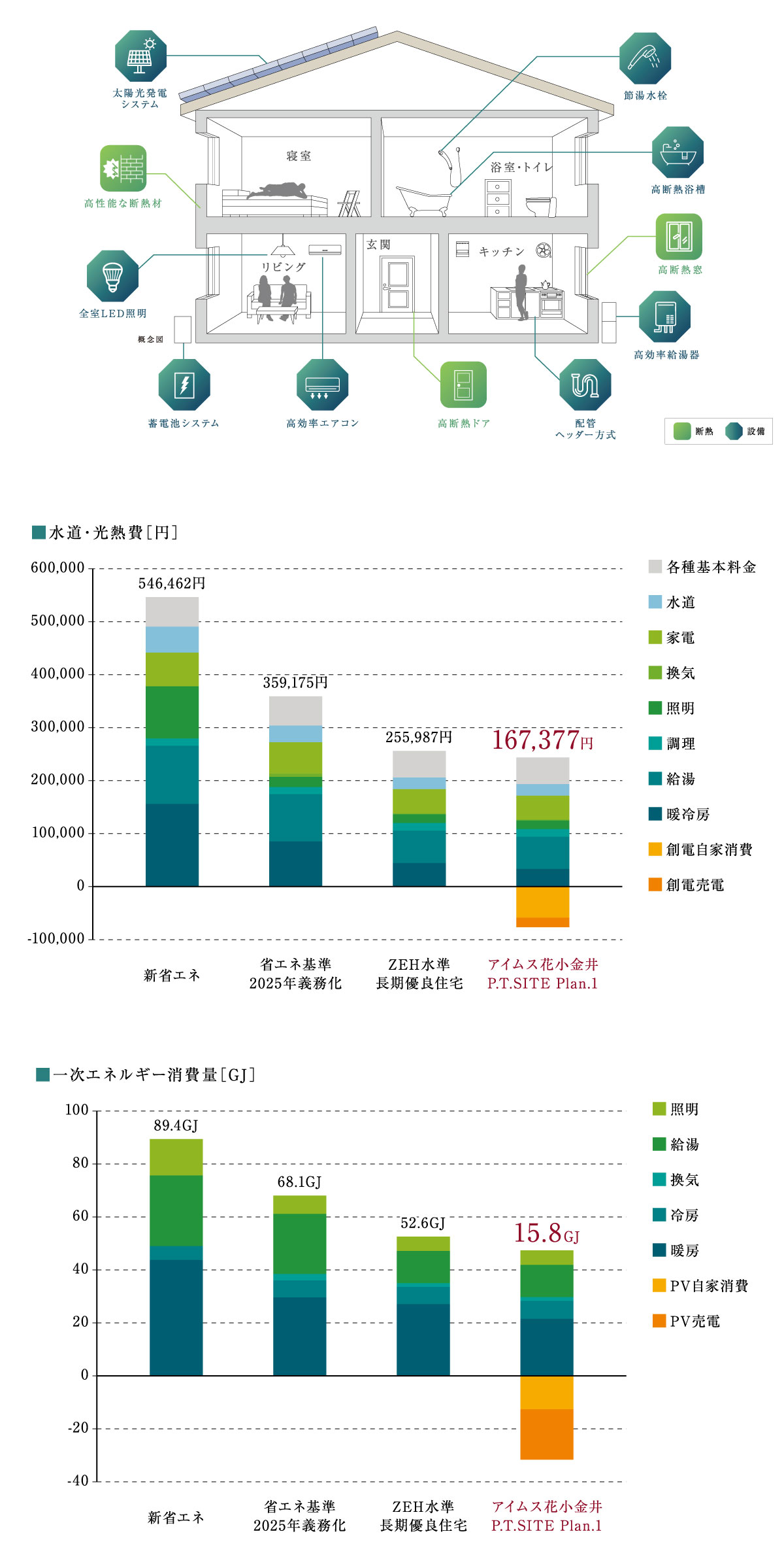 ※シミュレーション条件/家族人数:4人、建設地:東京都西東京市、床面積:109.47㎡、屋根勾配:3寸、パネル方位:南西、主な生活場所:リビング、日中在宅者:なし、空調設定:標準、睡眠時の空調:あり、床暖房:6.36畳 【新省エネ】断熱性能(Ua値):1.54W/㎡・K、太陽光発電:なし、空調システム:通常エアコン、換気:なし、給湯器:一般給湯器、給湯使用量:標準、照明器具:白熱灯、家電:通常、調理:ガス、節水(トイレ):なし、節湯(台所):なし、節湯(シャワー):なし、浴槽:通常、蓄電池:なし【 省エネ基準 2025年義務化】断熱性能(Ua値):0.87W/㎡・K、太陽光発電:なし、空調システム:通常エアコン、換気:第一種換気、給湯器:エコジョーズ、給湯使用量:標準、照明器具:蛍光灯、家電:通常、調理:ガス、節水(トイレ):あり、節湯(台所):なし、節湯(シャワー):なし、浴槽:通常、蓄電池:なし【 ZEH水準 長期優良住宅】断熱性能(Ua値):0.6W/㎡・K、太陽光発電:なし、空調システム:高効率エアコン、換気:第三種換気、給湯器:ハイブリッド給湯器、給湯使用量:標準、照明器具:LED、家電:省エネ、調理:ガス、節水(トイレ):あり、節湯(台所):あり、節湯(シャワー):あり、浴槽:高断熱、蓄電池:なし 【アイムス花小金井 P.T.SITE Pl an.1】断熱性能(Ua値):0.44W/㎡・K、太陽光発電:3.19kw、空調システム:高効率エアコン、換気:第三種換気、給湯器:ハイブリッド給湯器、給湯使用量:標準、照明器具:LED、家電:省エネ家電、調理:ガス、節水(トイレ):あり、節湯(台所):あり、節湯(シャワー):あり、浴槽:高断熱、蓄電池:6.5kWh ■ポラス暮し科学研究所オリジナルシミュレーター「ECO-Fit」により算出。試算数値は目安となります。実際の光熱費を保証するものではございません。水道光熱費の料金単価は建設地の代表的な供給会社の値を基にしています。売電単価は16円/kWhです。