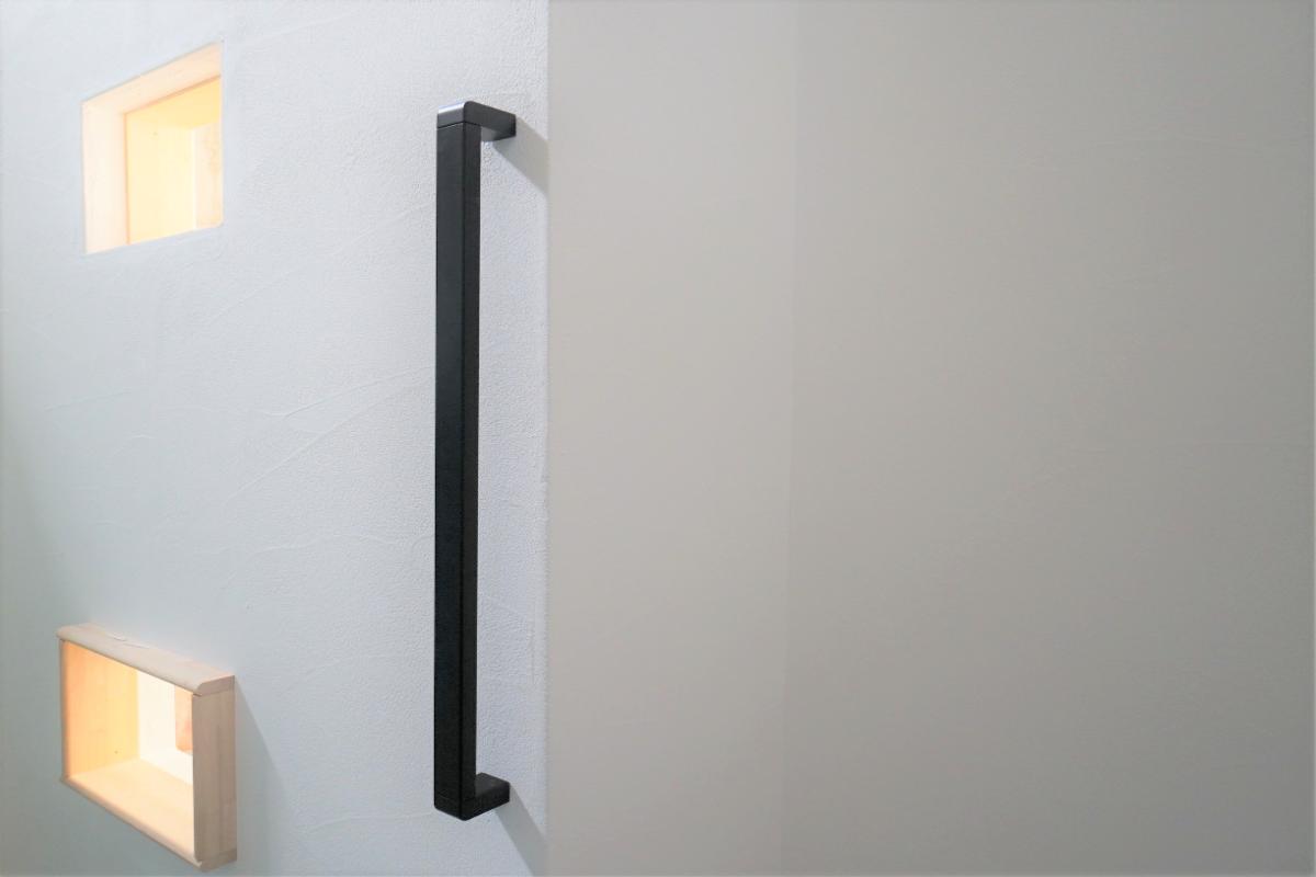 玄関にはシンプルモダンな手すりを採用。角部の丸みは安全性を高め、握りやすさなど細かなこだわりが散りばめられています。