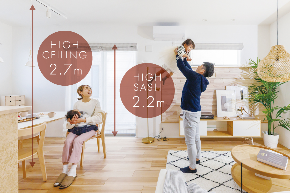 のびのびとゆとりをもって過ごせるようリビング・ダイニングの天井高を2.7m、掃出しサッシ高を2.2mに設定しました。※一部天井が下がる場合がございます。