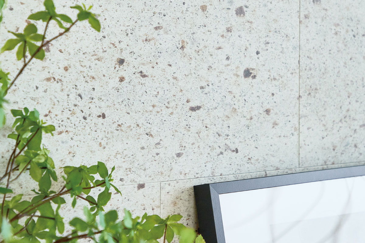 掘り炬燵は、小上がりの空間の中央部に。掘り炬燵を使用しない場合は畳によって埋めることができます。 壁面には斑点が様々な表情を生み出す石目調の素材を使用。格子を用いることで和の雰囲気を醸し出し、障子から漏れる優しい陽光が心を和ませてくれます。また、この空間では渋みのある古材を採用。繊細かつ力強い技が古き良き時代の味わいを漂わせています。
