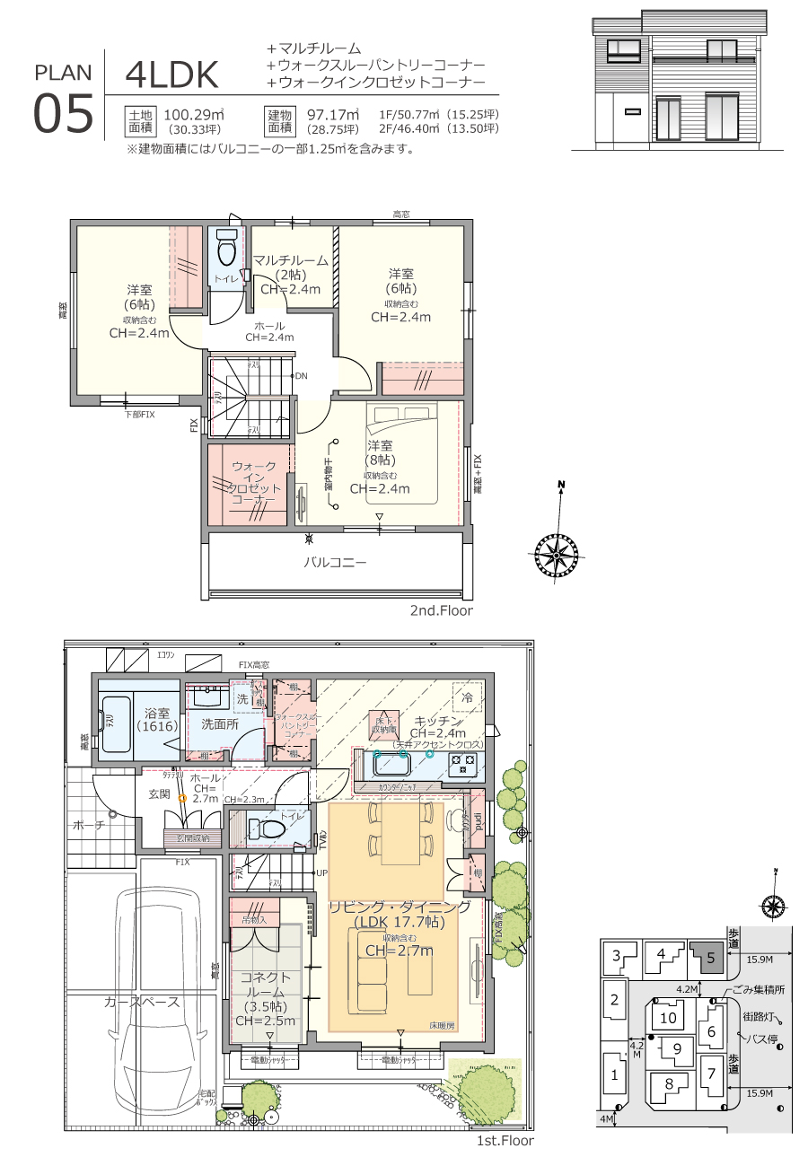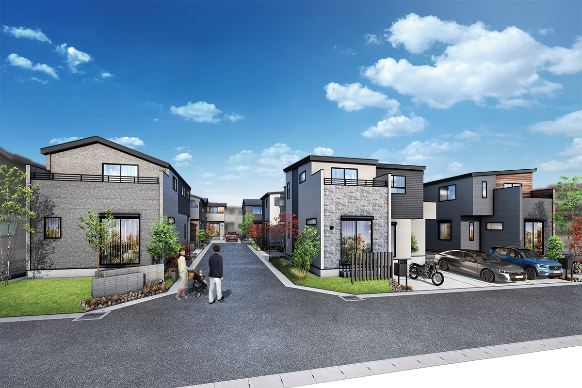 分譲地内のLの字型道路は、住まう方同士が自然に顔を合わせるコミュニティスペースに。