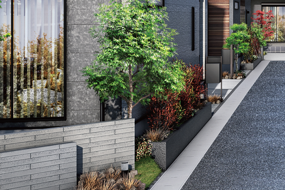 木目・石目調の外壁に溶け込む、彩りある木々を植樹。自然のやさしさが住まいを包み込み、街並みに心地よい潤いをもたらします。
