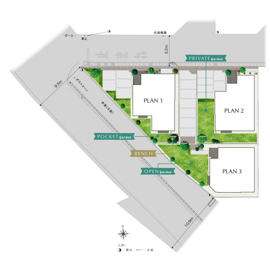 3邸それぞれに魅力のちがうガーデンスタイルを享受できるこの街。