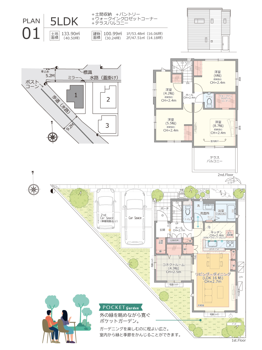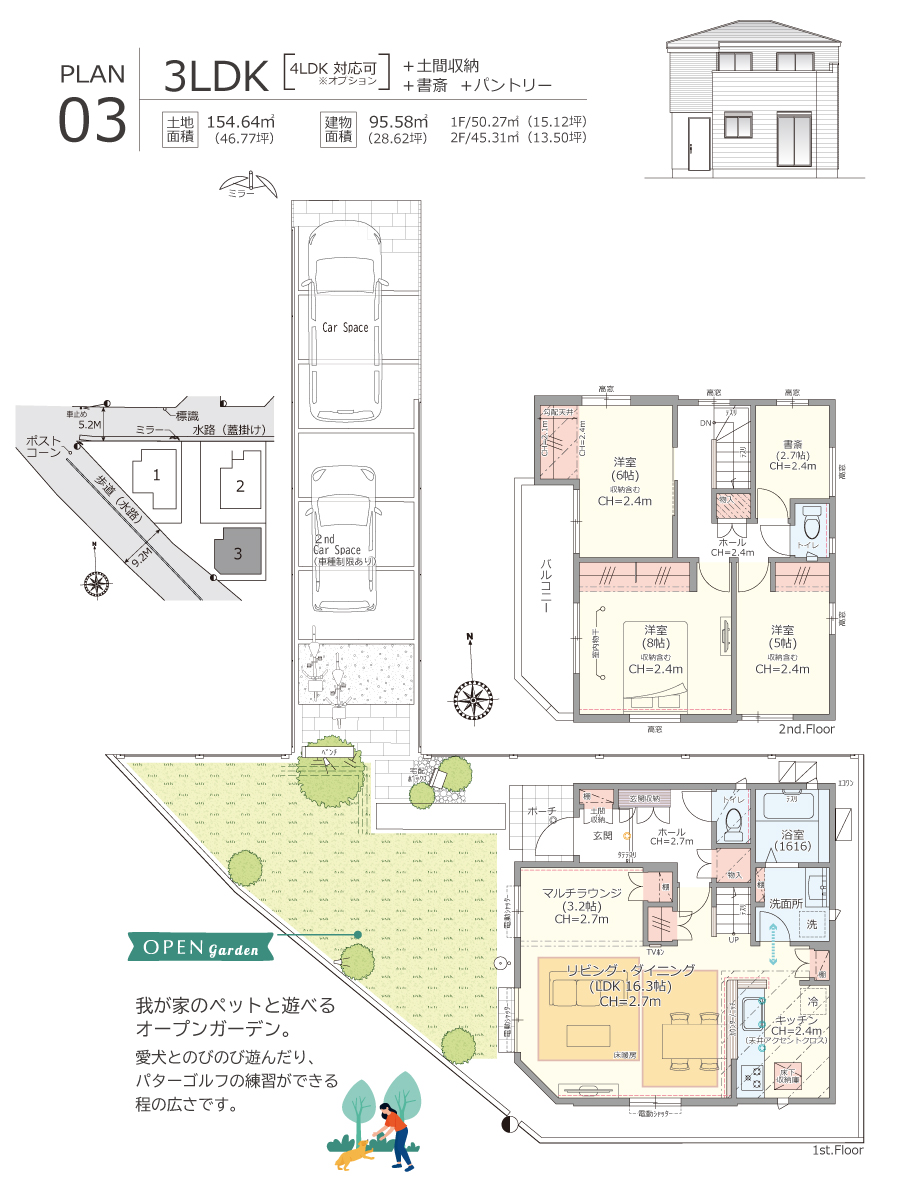 2台分のカースペースと庭を確保した贅沢なプランニング。